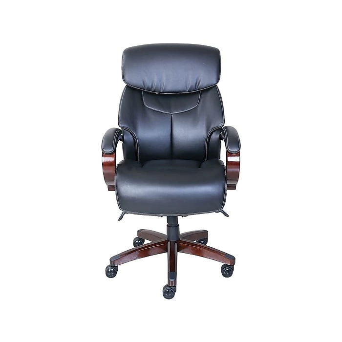 Create a bold, modern look for your office with this La-Z-Boy Bradley executive office chair. The rich bonded leather upholstery and contrast stitching deliver upscale style, while the plush ComfortCore cushioning ensures all-over support. A waterfall seat design promotes better circulation so you can sit comfortably for longer. This chair boasts pneumatic seat height adjustment, tilt tension and tilt lock, providing convenient customization options. Fixed padded loop arms offer a place to way to rest your shoulders, hands and wrists after marathon typing sessions. Featuring a wood-finish five-star base and rolling casters, this La-Z-Boy Bradley executive office chair moves effortlessly from one side of your office to the other.