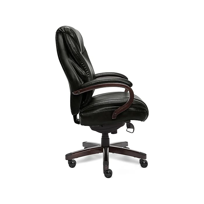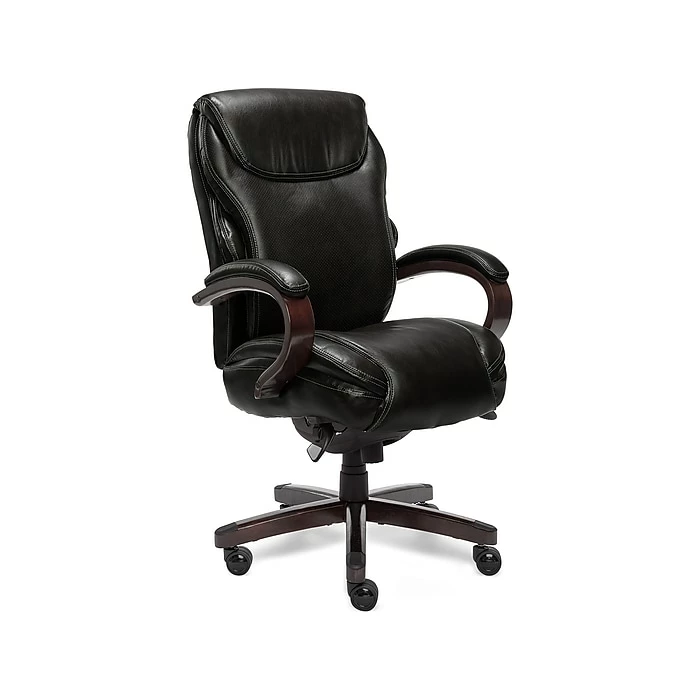 Trusted Quality and Craftsmanship From a trusted brand known for quality, traditional craftsmanship and comfort, the La-Z-Boy Hyland ComfortCore Traditions AIR Technology Executive Office Chair delivers advanced performance for exceptional support and comfort at work and play. Superior Comfort Technology The ComfortCore Plus with Memory Foam advanced layering system offers unique zone-based support, placing cushioning in the areas you need it most. The strategically-assigned plush body pillowing and padded headrest on this office chair combine to provide neck support and minimize pressure points for relief from discomfort caused by prolonged sitting. Ergonomic Design and Lumbar Support Technology This Wellness By Design series La-Z-Boy office chair uses flexible AIR Lumbar Technology that pivots and conforms the lumbar area according to your movement, helping to improve posture, reduce discomfort and provide superior back support. This ergonomic chair is fully adjustable, letting you control height, tilt and lift to suit your needs for customized positioning and optimized body alignment. Built to Last This executive office chair features a thicker plywood subcore, reinforced back bar and heavy-duty castors for durability you can count on for all your day-to-day activities. Traditional Style, Contemporary Functionality Crafted with wood components, this high-back office chair with hand-sculpted arms is upholstered in soft bonded leather to create an elegant blend of traditional style and modern performance that is ideal for any office, home or entertainment space.