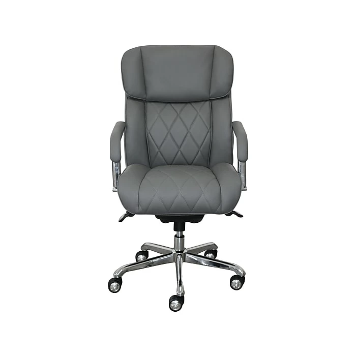 - Gray bonded leather upholstery with modern stitching accents complements the polished chrome base