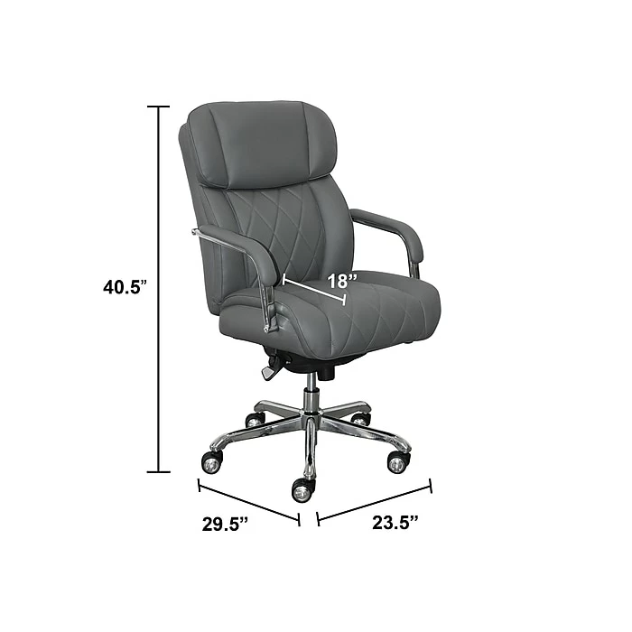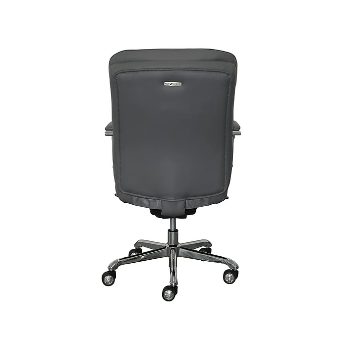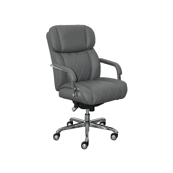 Complete the stylish look of your desk or home office space with the La-Z-Boy Sutherland bonded leather office chair. The Sutherland is upholstered in gray bonded leather and features stylish quilted stitching accents along the back and seat. Beautiful quilted stitching accents and generously padded headrest, arms, seat, and back add a sense of luxury to the modern, feminine design of this desk chair. The La-Z-Boy Sutherland office chair is perfect for positioning at your office desk, and the contoured lumbar will stay comfortable and supportive during long hours at work. The five casters allow the chair to glide easily, and the pneumatic seat height adjustment allows you to find your optimal comfort level. Live life comfortably with the La-Z-Boy Sutherland leather office chair.
