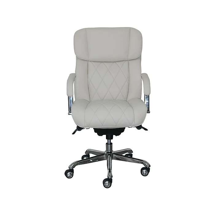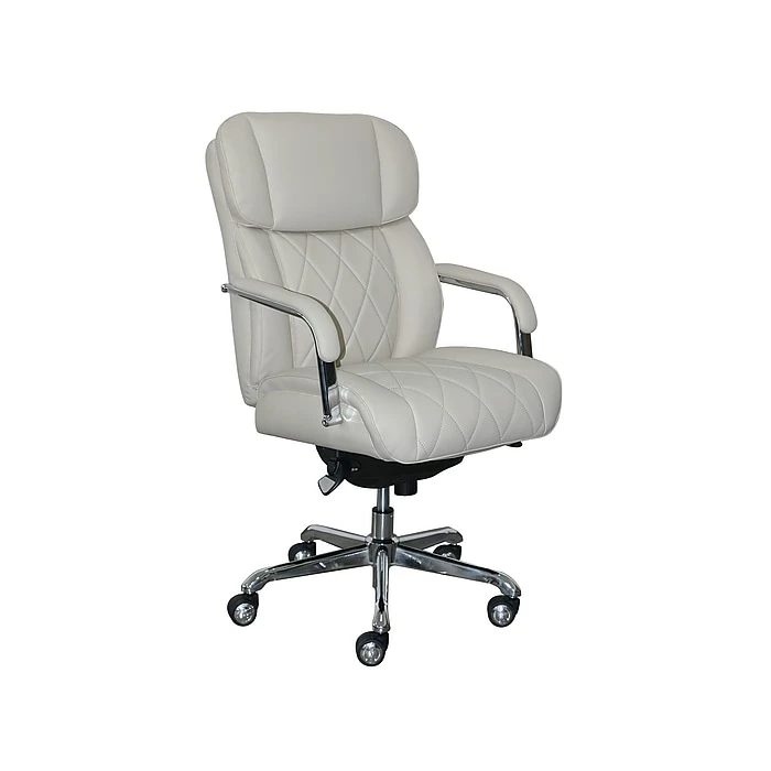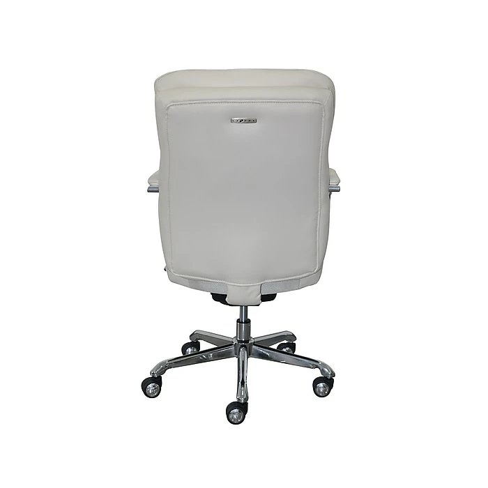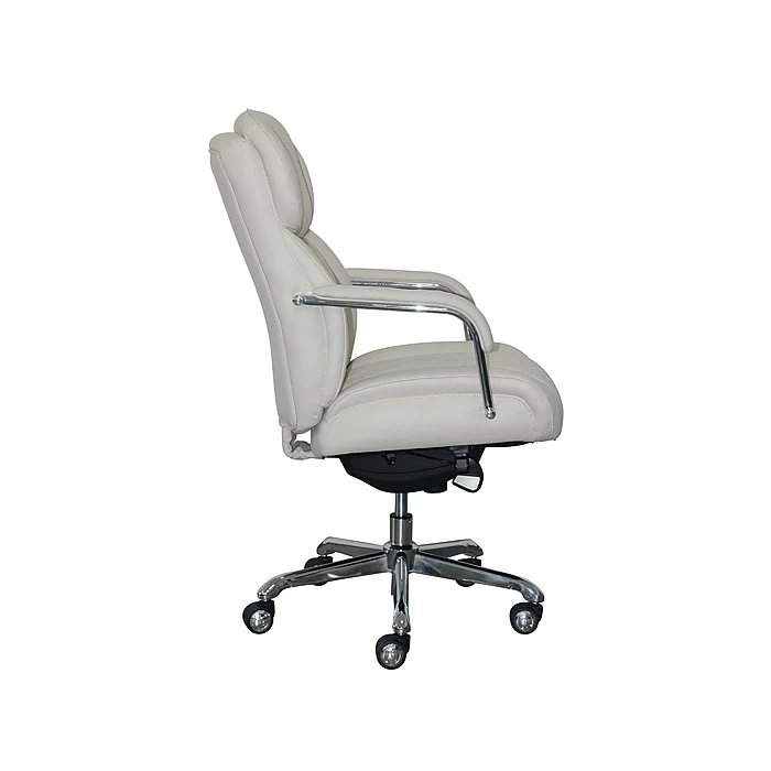 Complete the stylish look of your desk or home office space with the La-Z-Boy Sutherland Leather Office Chair. This modern office chair is available in your choice of black, gray, or ivory colored bonded leather or cream colored fabric, and is supported by a polished chrome base with five casters for easy movement. Beautiful quilted stitching detail and generously padded headrest, arms, seat, and back add a sense of luxury to the modern, feminine design of this desk chair. The La-Z-Boy Sutherland Office Chair is perfect for positioning at your office desk, and the contoured lumbar will stay comfortable and supportive during long hours at work. The five casters allow the chair to glide easily and the pneumatic seat height adjustment allows you to personalize to your comfort level. Live life comfortably with the La-Z-Boy Sutherland Leather Office Chair.