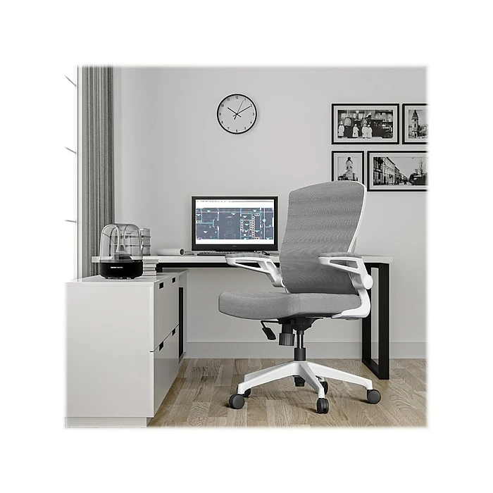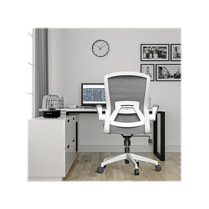 - Durable white nylon frame with a mesh back and seat covered in gray fabric