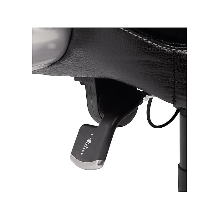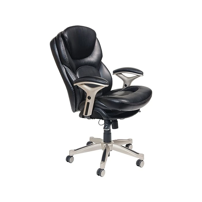 Work in style and comfort in this office chair featuring Active Seating Technology. This mid-back chair boasts an ergonomic design that delivers support where needed, and the pneumatic lift features adjustable tension and lock-out functionality for personalized seating. Side levers allow for convenient customization for height and tilt adjustments. This chair delivers soft support with body cushions that gather in their centers to enhance the plush experience. A heavy-duty frame with five easy-glide casters makes it easy to move from the printer to your desk and back again. This Serta Back-in-Motion office chair features black leather that is eco-friendly and sumptuously soft.