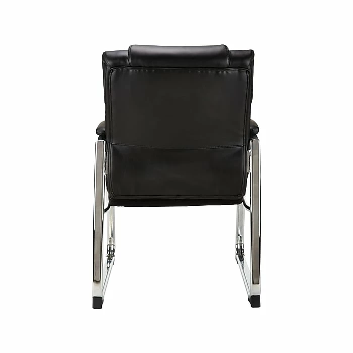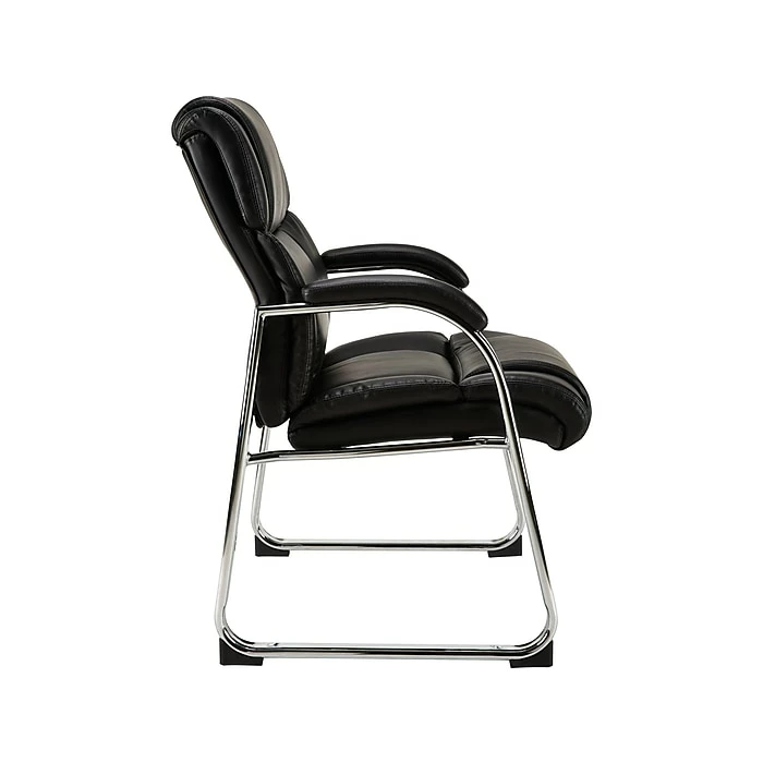 Create a warm, welcoming seating area for visitors to your building with this bonded leather guest chair. Contoured, segmented padding throughout the seat and seat back offer plush comfort, while the curved, padded armrests offer upper body support. This chair boasts bonded leather upholstery, providing both durability and sleek style. A sled-style base keeps this guest chair stable on a wide range of flooring surfaces, while the integrated floor glides prevent scratches and scuffs. With polished chrome accents and a sleek silhouette, this Sonada guest chair brings an upscale modern look to your private office, reception area, or lobby.