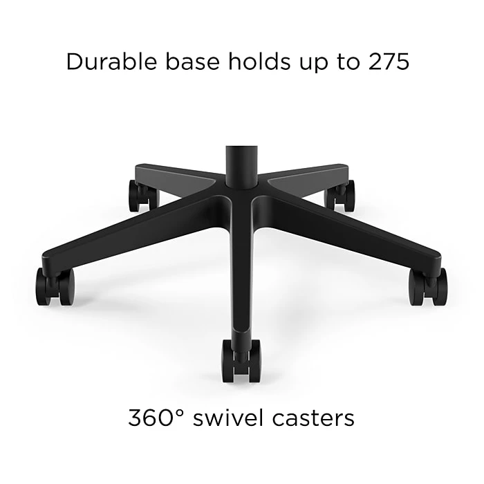 Maximize comfort while working on your daily deliverables with this black fabric chair. Five 360-degree casters let you move to and from the printer station freely, while the fabric upholstery withstands daily use. The contoured back and ample padding offer support during long workdays, while pneumatic height adjustment lets you find the optimal eye-to-screen position, promoting good posture. Configure the recline and tilt functions effortlessly with the built-in tilt tension knob, and unlock or lock your chair in an upright position using tilt lock. Fixed armrests accommodate your arms for additional support. This Essentials fabric chair features a premium framework that meets ANSI/BIFMA standards for reliable performance and lasting use.